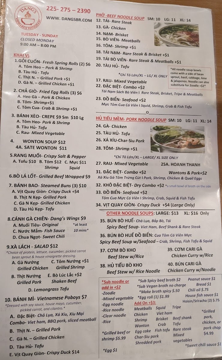 Welcome to Dang's, a culinary gem nestled in Baton Rouge, Louisiana. Specializing in traditional Vietnamese cuisine, Dang's invites you to indulge in a menu filled with authentic flavors. Start your meal with the irresistible Crepe Banh Xeo, featuring options like pork and shrimp or crispy tofu, served with a vibrant assortment of fresh herbs and dipping sauce.